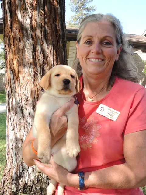 Tagg is a yellow Labrador retriever born on8-10-13. He was one of twelve puppies! His puppy raiser was Laurel. He graduated on October 18 and was matched with Kassandra from Pennsylvania